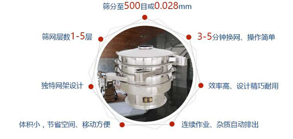 3、篩網(wǎng)不阻塞、粉末不飛揚、篩分細(xì)可達500目(28微米)過濾細(xì)可達5微米。